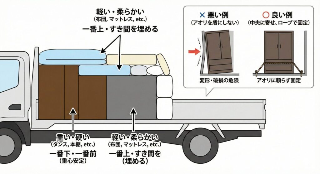 - 定義: 軽トラックのアオリ(荷台の側面の板)の高さを超えない範囲で積むこと。