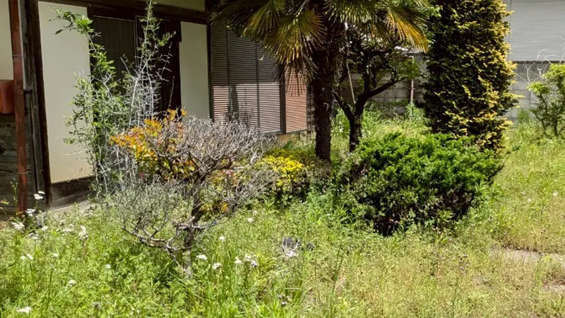 - 庭・カーポートの奥: 劣化してボロボロになったタイヤ、錆びた自転車、放置された植木鉢など。