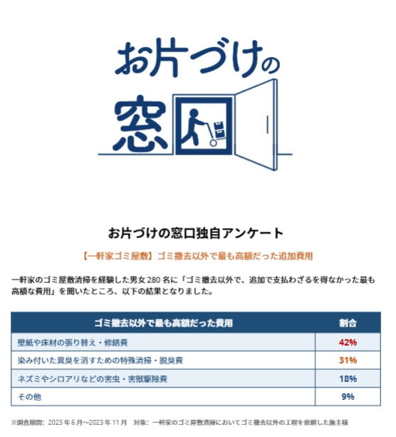 一軒家のゴミ屋敷清掃を経験した男女280名に「ゴミ撤去以外で、追加で支払わざるを得なかった最も高額な費用」を聞いたところ、以下の結果となりました。