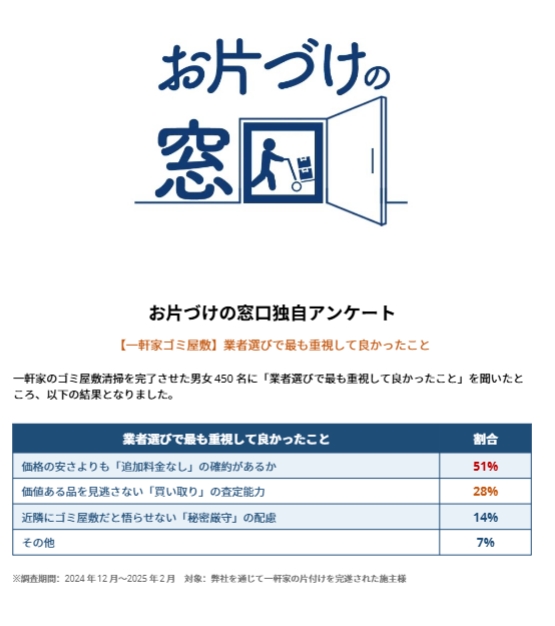 一軒家のゴミ屋敷清掃を完了させた男女450名に「業者選びで最も重視して良かったこと」を聞いたところ、以下の結果となりました。
