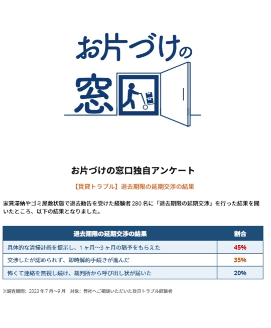 家賃滞納やゴミ屋敷状態で退去勧告を受けた経験者280名に「退去期限の延期交渉」を行った結果を聞いたところ、以下の結果となりました。