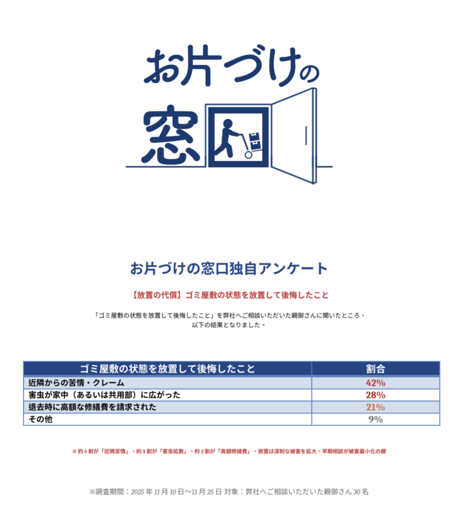 「ゴミ屋敷の状態を放置して後悔したこと」を弊社へご相談いただいた親御さんに聞いたところ、以下の結果となりました。