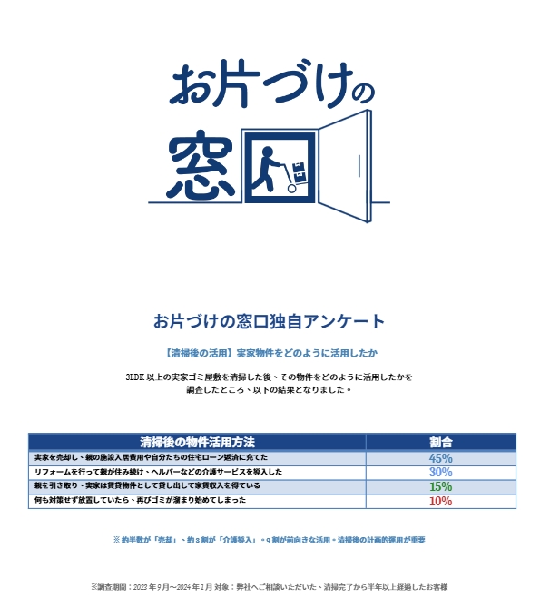 約半数の方が、綺麗にした家を「売却(現金化)」しています。 ゴミを片付けることは、単なる掃除ではなく、「凍結されていた資産を解凍する行為」なのです。
