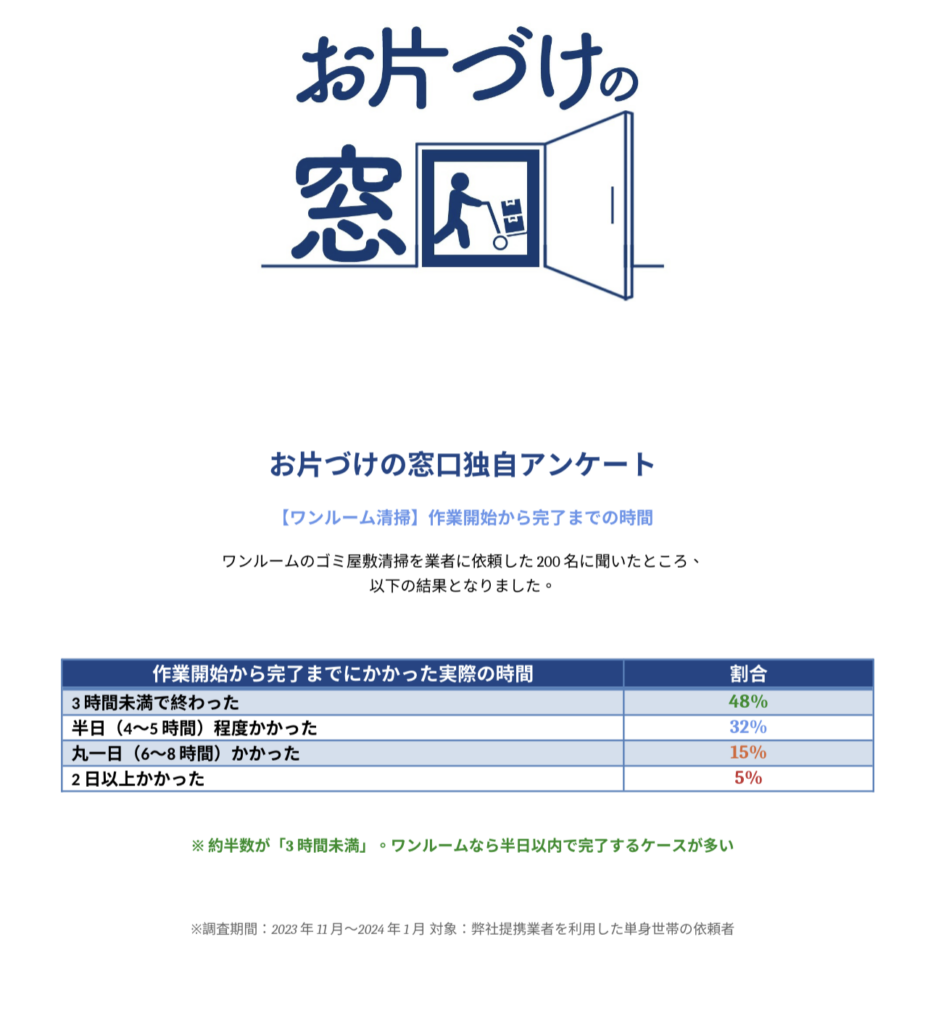 ワンルームのゴミ屋敷清掃を業者に依頼した200名に「作業開始から完了までにかかった実際の時間」を聞いたところ、以下の結果となりました。