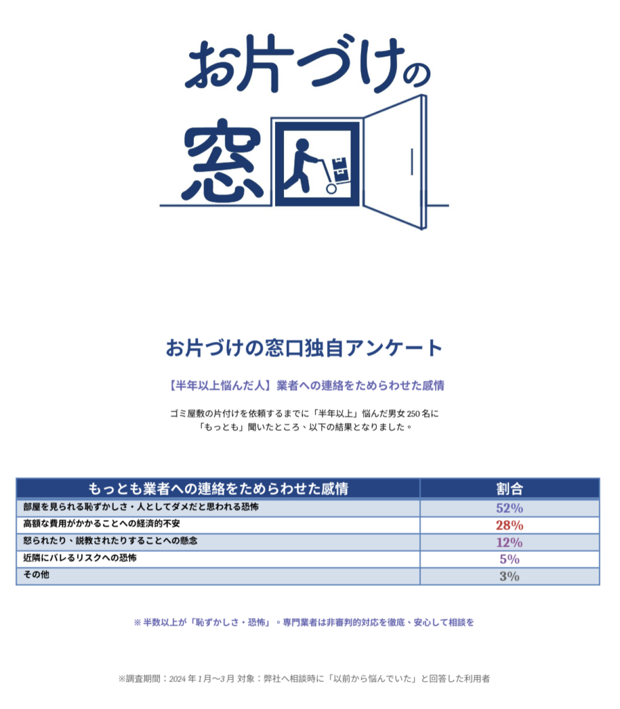ゴミ屋敷の片付けを依頼するまでに「半年以上」悩んだ男女250名に「もっとも業者への連絡をためらわせた感情」を聞いたところ、以下の結果となりました。