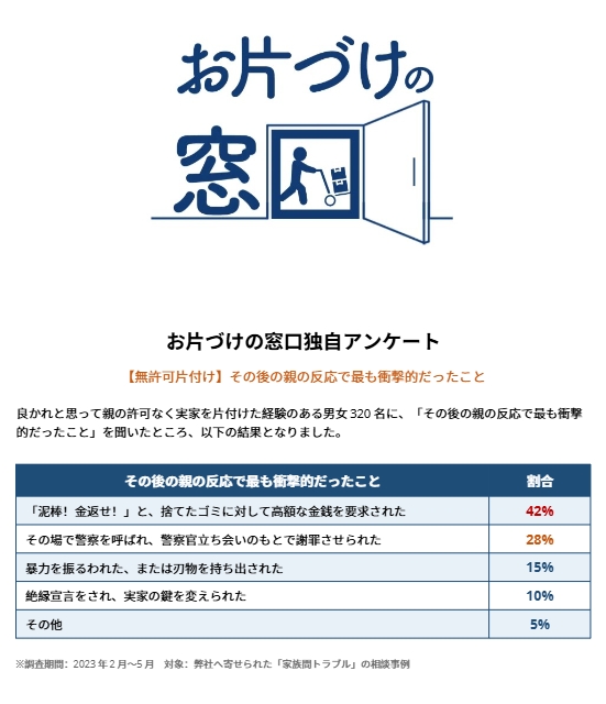 良かれと思って親の許可なく実家を片付けた経験のある男女320名に、「その後の親の反応で最も衝撃的だったこと」を聞いたところ、以下の結果となりました。