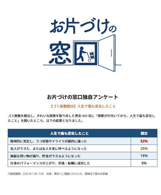 ゴミ屋敷を脱出し、きれいな部屋を取り戻した男女400名に「部屋が片付いてから、人生で最も変化したこと」を聞いたところ、感動的な結果となりました。