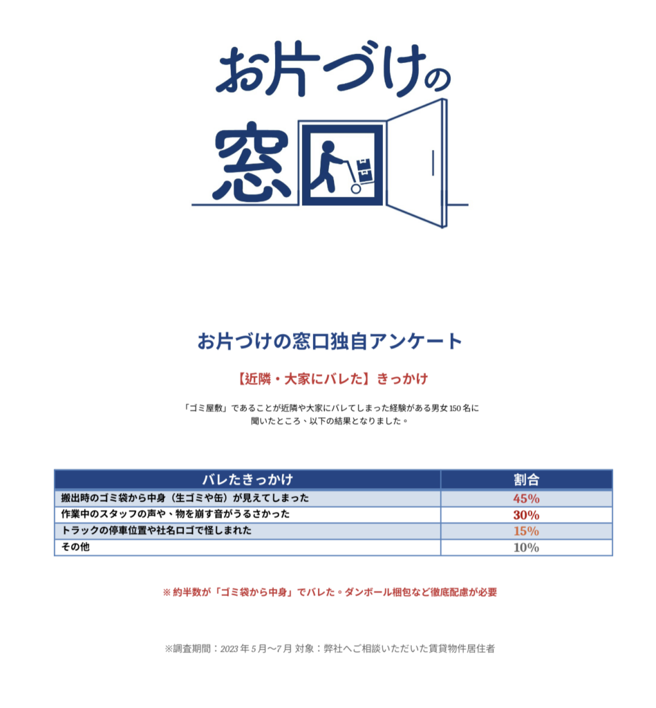 「ゴミ屋敷」であることが近隣や大家にバレてしまった経験がある男女150名に「バレたきっかけ」を聞いたところ、以下の結果となりました。