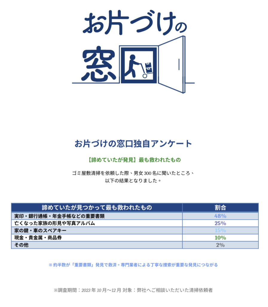 ゴミ屋敷清掃を依頼した際、「諦めていたが見つかって最も救われたもの」を男女300名に聞いたところ、以下の結果となりました。