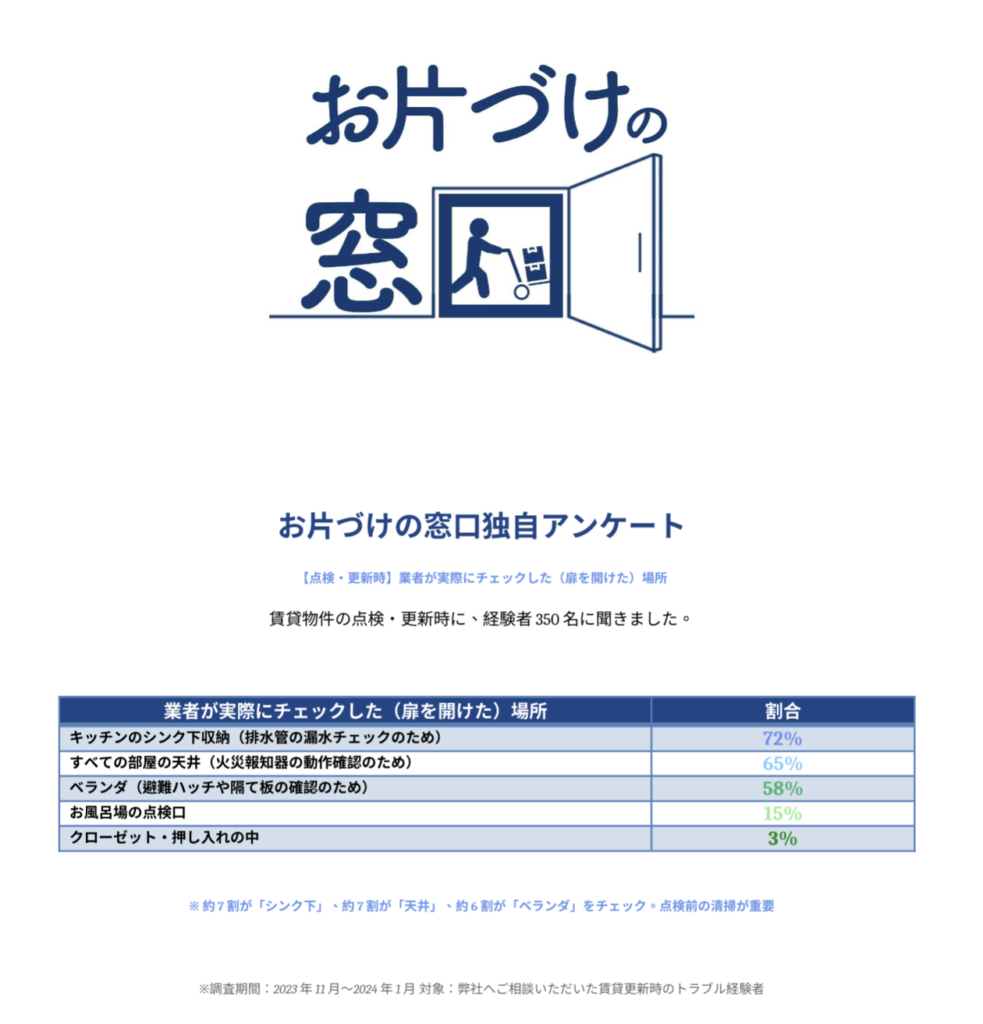 このデータから分かる通り、クローゼットやお風呂場(浴槽内)は比較的安全地帯です。 どうしても捨てきれないゴミ袋は、一時的にここに積み上げ、点検が終わった瞬間に搬出計画を立て直してください。ただし、シンク下だけは絶対に空けておく必要があります。ここを塞ぐと点検不能となり、再訪問(=バレる)の原因になります。