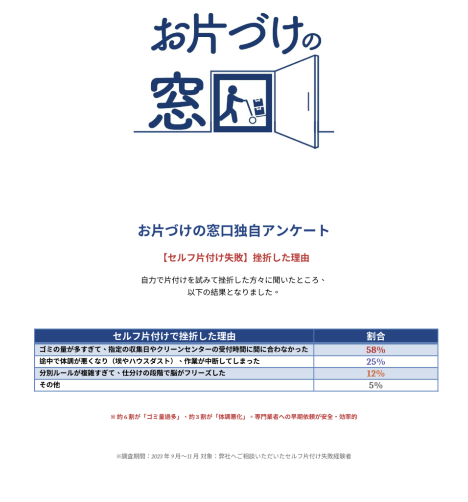 ※調査期間:2023年9月〜11月 対象:弊社へご相談いただいたセルフ片付け失敗経験者