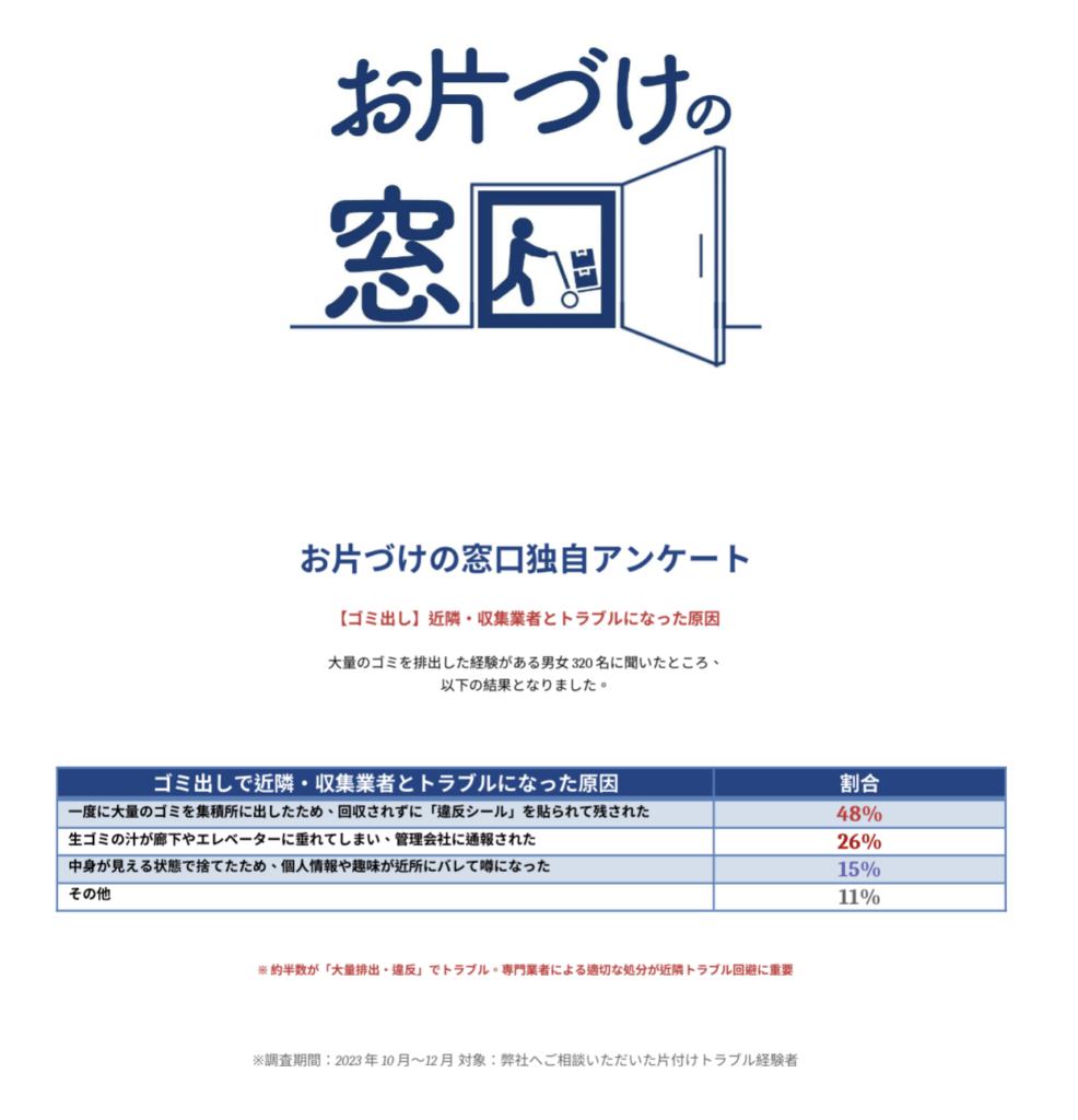 大量のゴミを排出した経験がある男女320名に「ゴミ出しに関して近隣住民や収集業者とトラブルになった原因」を聞いたところ、以下の結果となりました。