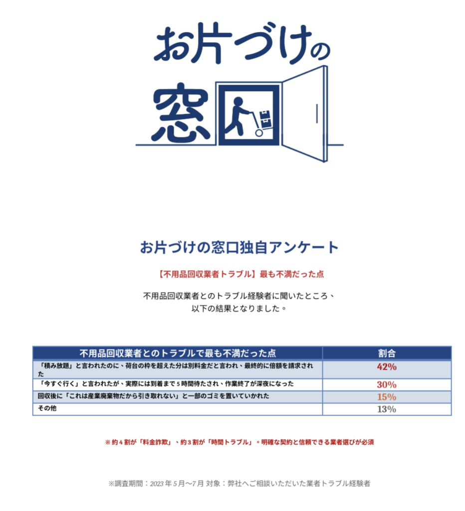 - 回収後に「これは産業廃棄物だから引き取れない」と一部のゴミを置いていかれた(15%)