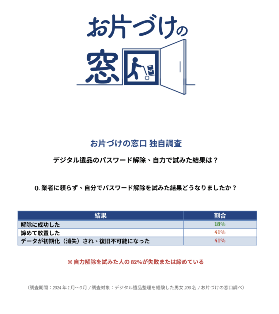 (調査期間:2024年1月〜3月 / 調査対象:デジタル遺品整理を経験した男女200名 / お片づけの窓口調べ)