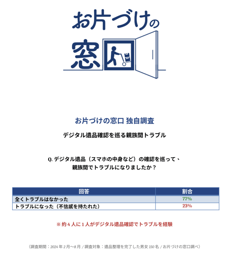 (調査期間:2024年6月〜12月 / 調査対象:デジタル遺品調査を依頼した遺族150名 / お片づけの窓口調べ)