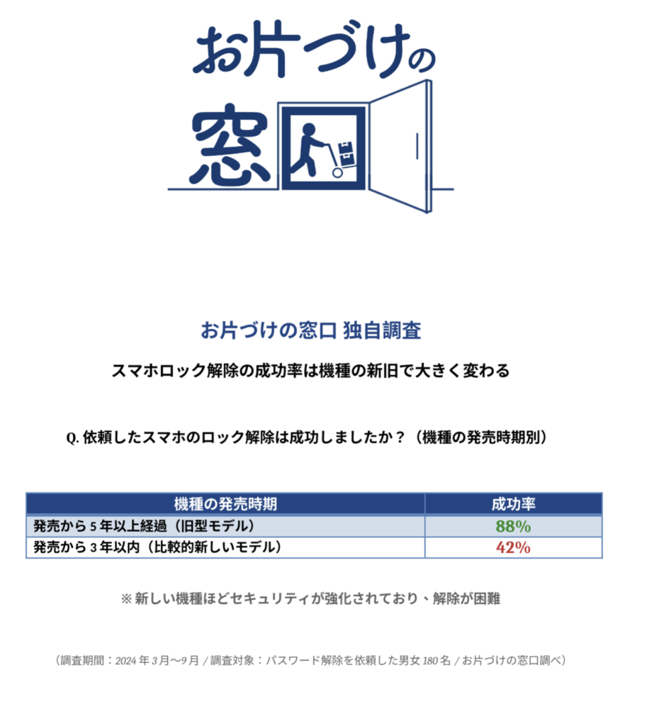 「プロに頼めば、まあなんとかなるだろう」 そう期待したいところですが、機種の新しさは成功率に直結します。 私たち『お片づけの窓口』では、実際に業者へ依頼した経験者180名を対象に、機種の新旧による解除成功率の違いを調査しました。