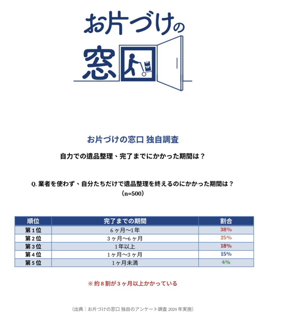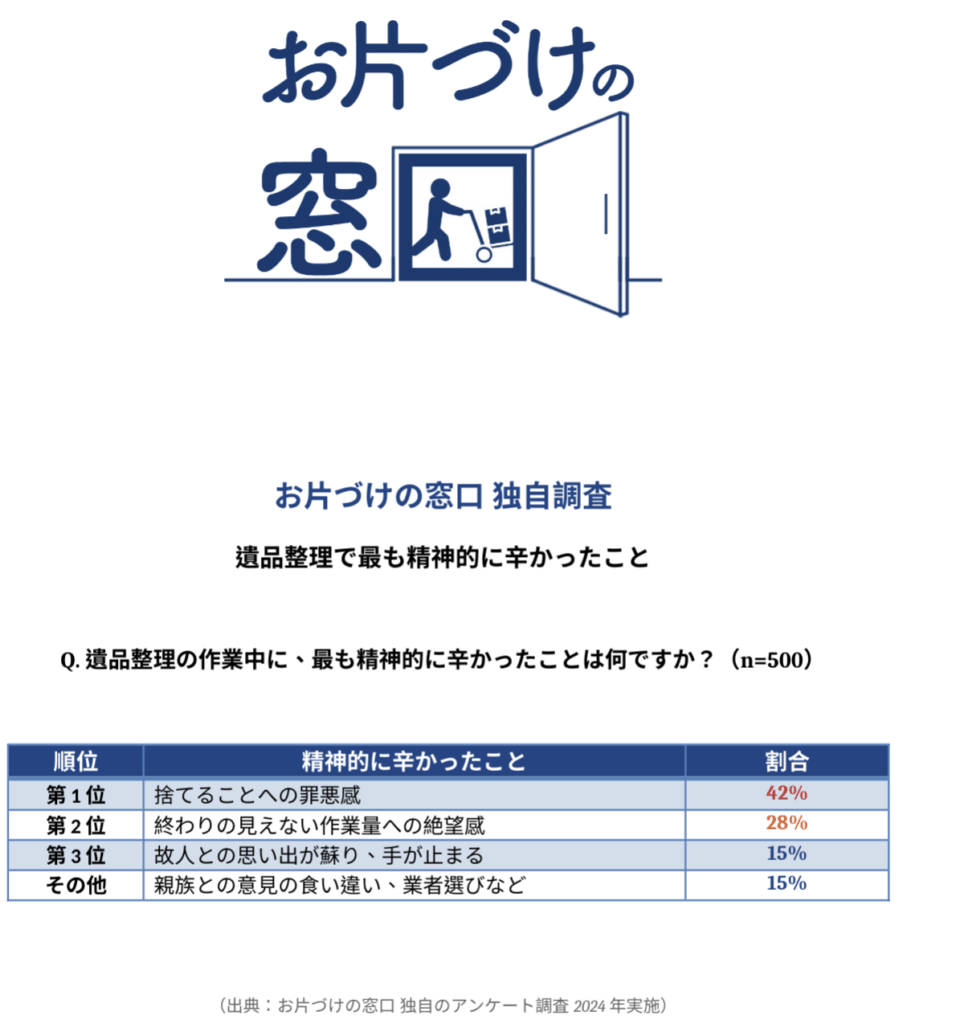 ここで、私たち「お片づけの窓口」が行った独自アンケートの結果をご覧ください。これから遺品整理に臨む方が、何に備えるべきかが見えてきます。