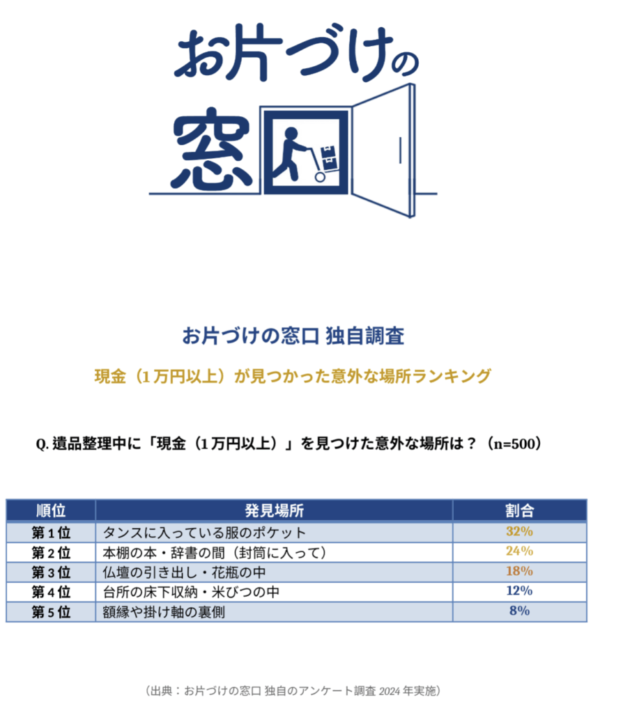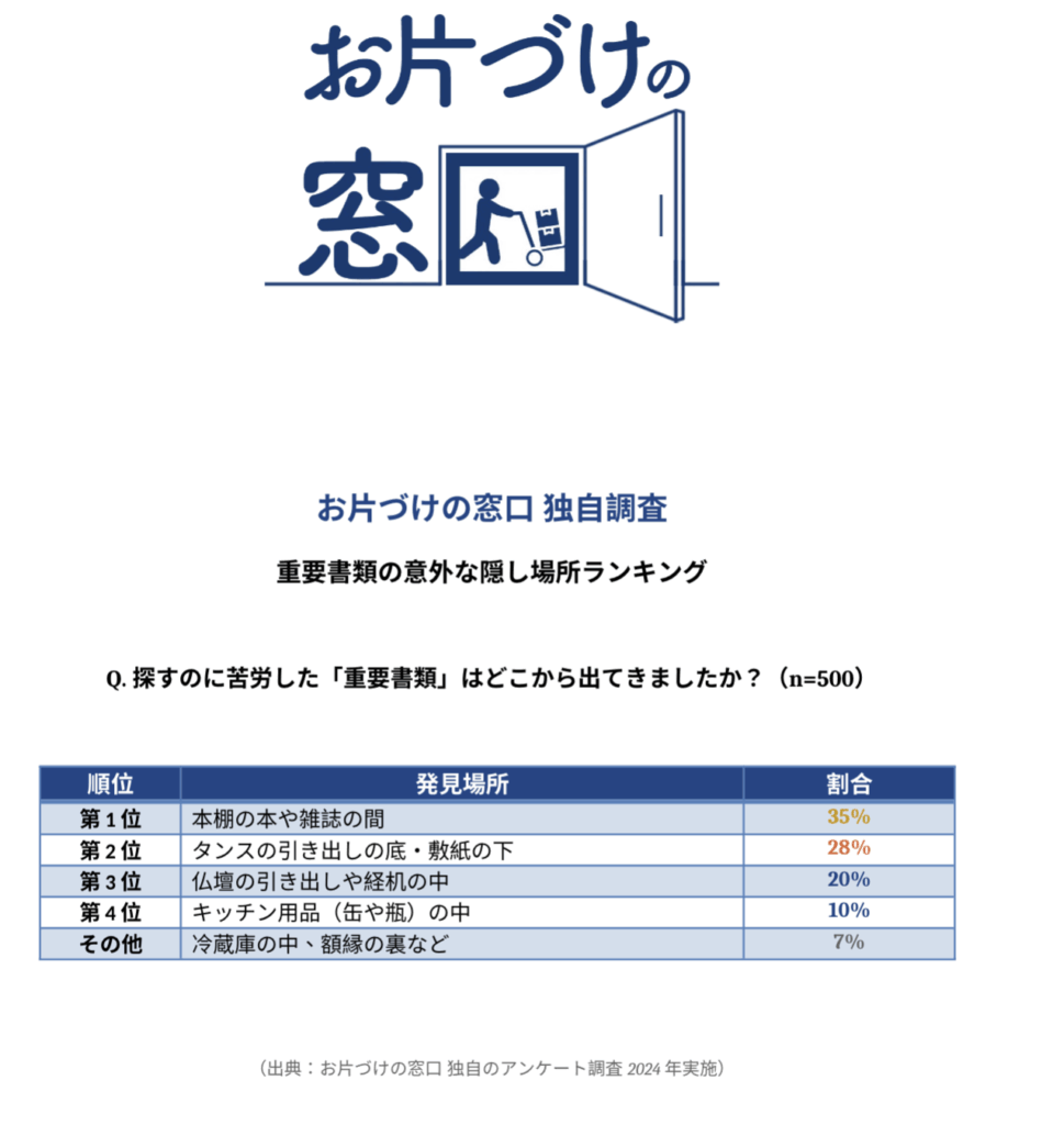 「うちは隠し場所なんてないから」と高を括るのは危険です。 私たちは独自のアンケート調査で、「予想外の場所」から書類が見つかる実態を明らかにしました。
