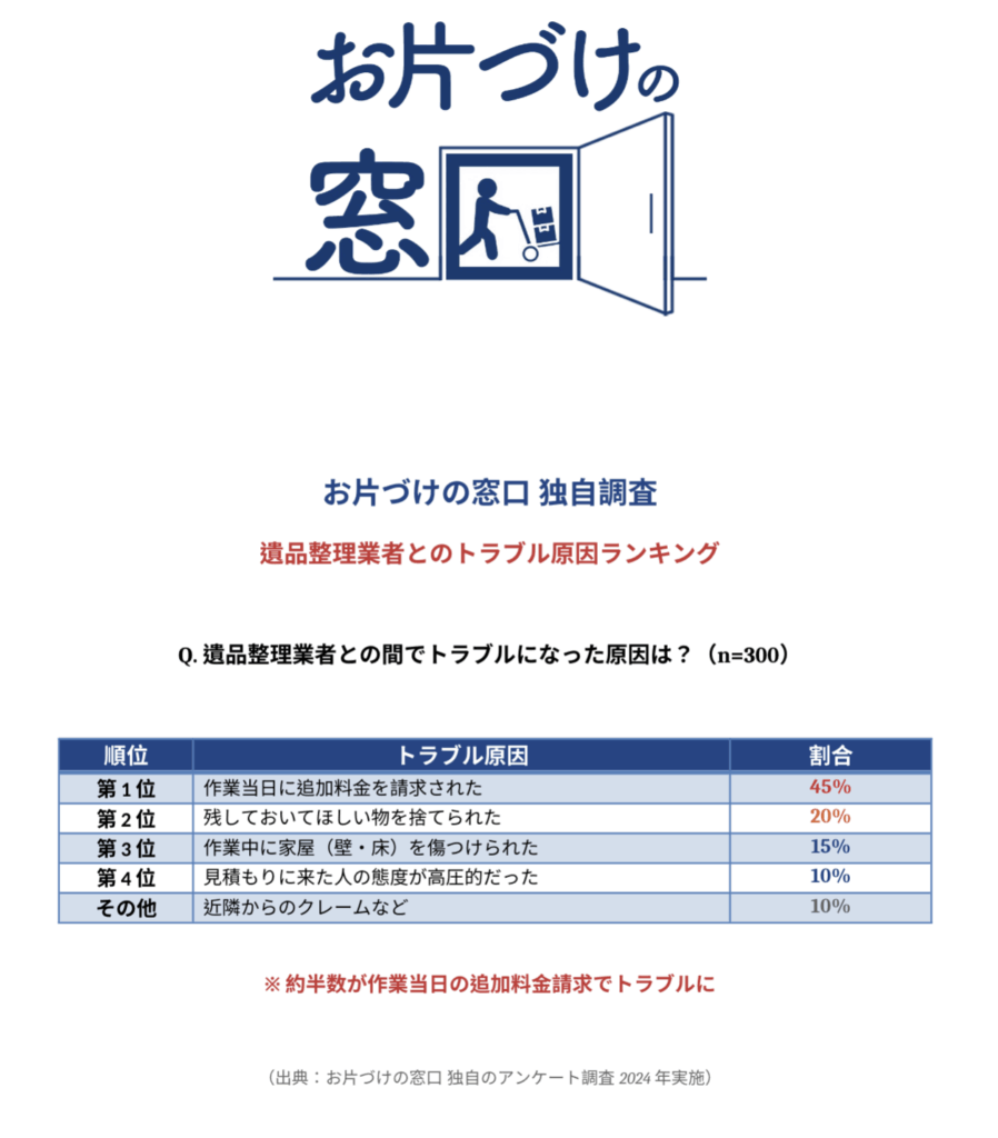 圧倒的に多いのが金銭トラブルです。次いで「誤廃棄」。 これを防ぐためにも、「追加料金なしの確約」と「絶対に残すものリストの共有」は必須です。