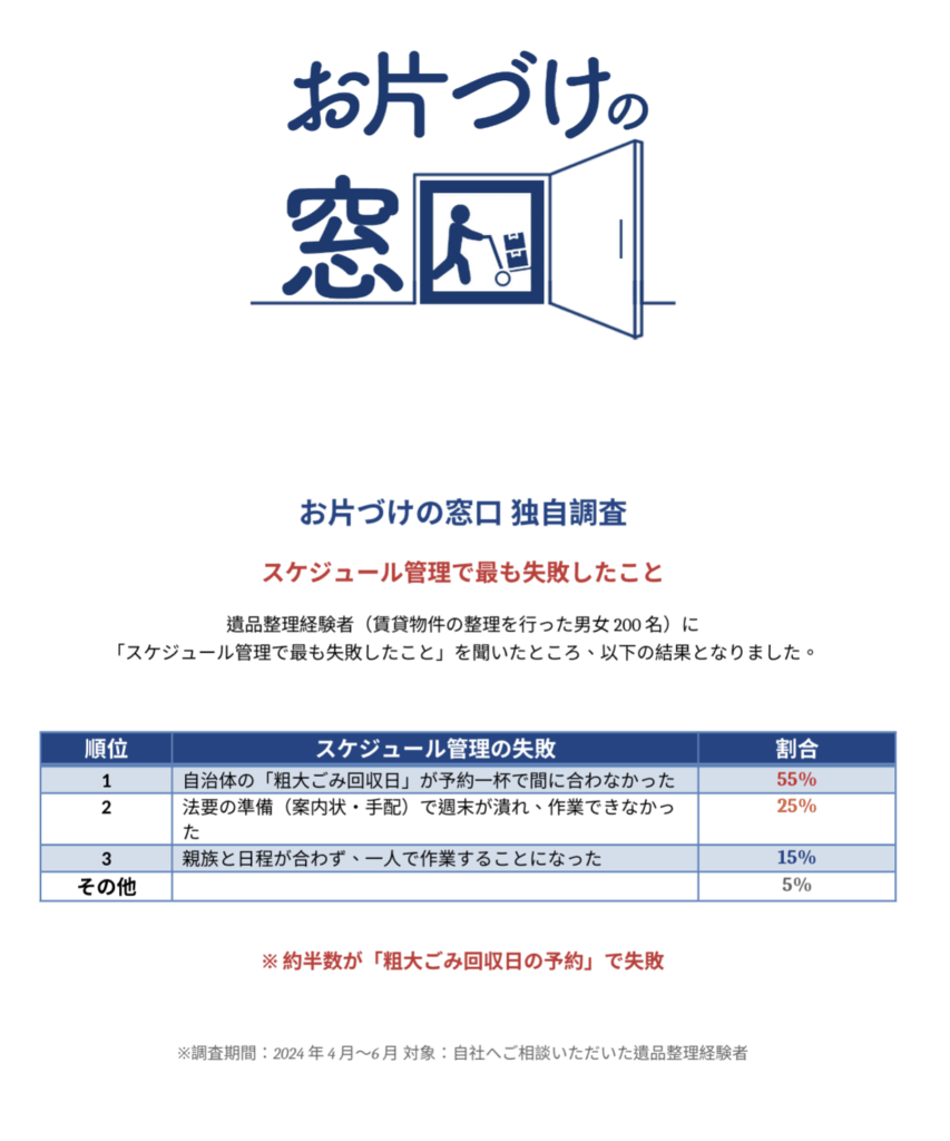 遺品整理経験者(賃貸物件の整理を行った男女200名)に「スケジュール管理で最も失敗したこと」を聞いたところ、以下の結果となりました。