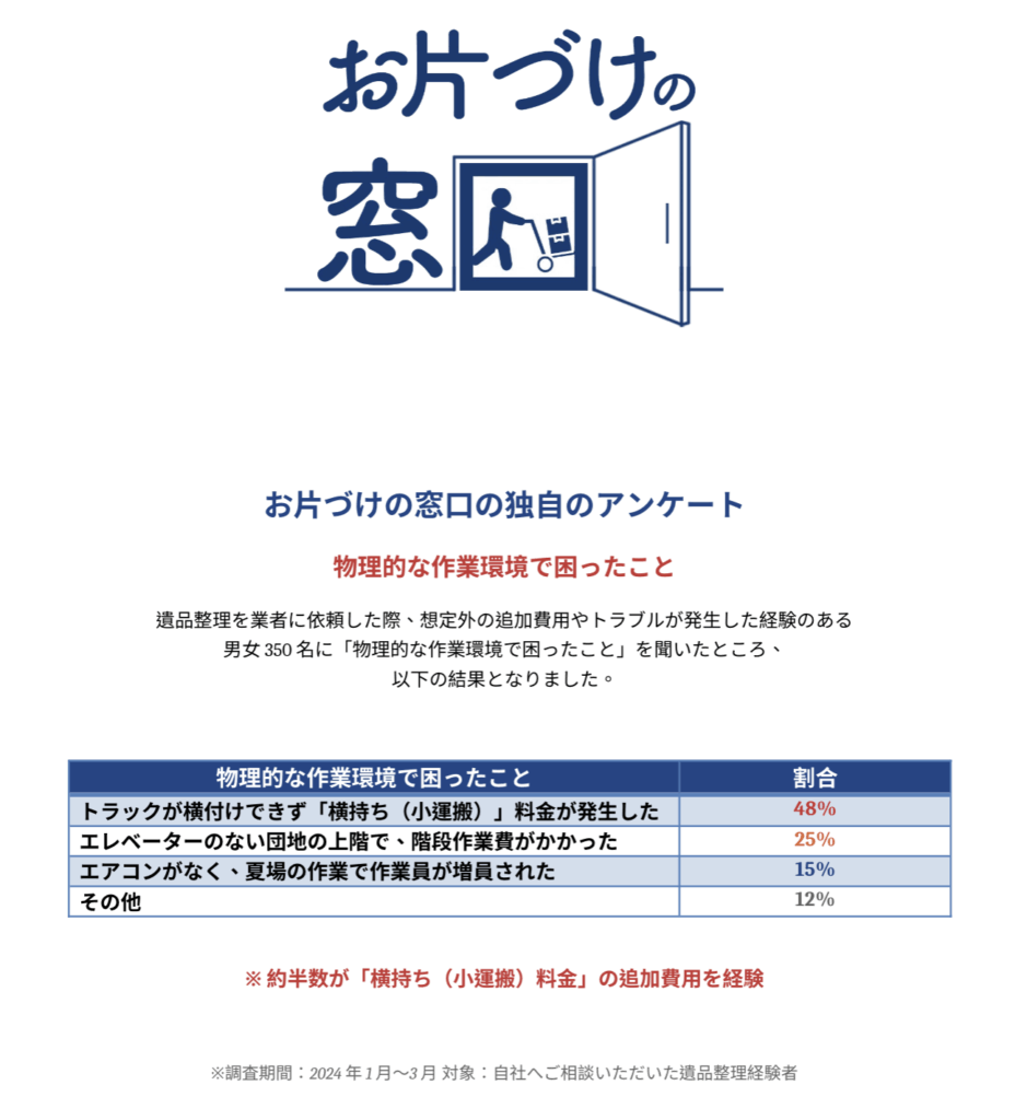遺品整理を業者に依頼した際、想定外の追加費用やトラブルが発生した経験のある男女350名に「物理的な作業環境で困ったこと」を聞いたところ、以下の結果となりました。