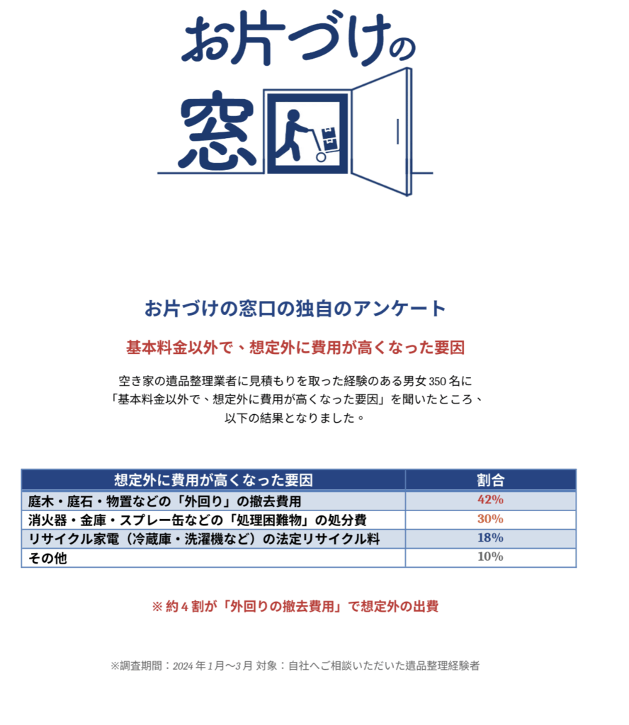 4割以上の方が、家の中よりも「庭」や「外」の片付けで予算オーバーしています。見積もりの際は、家の中だけでなく「庭のブロック一つまで」範囲を明確に指定することが重要です。