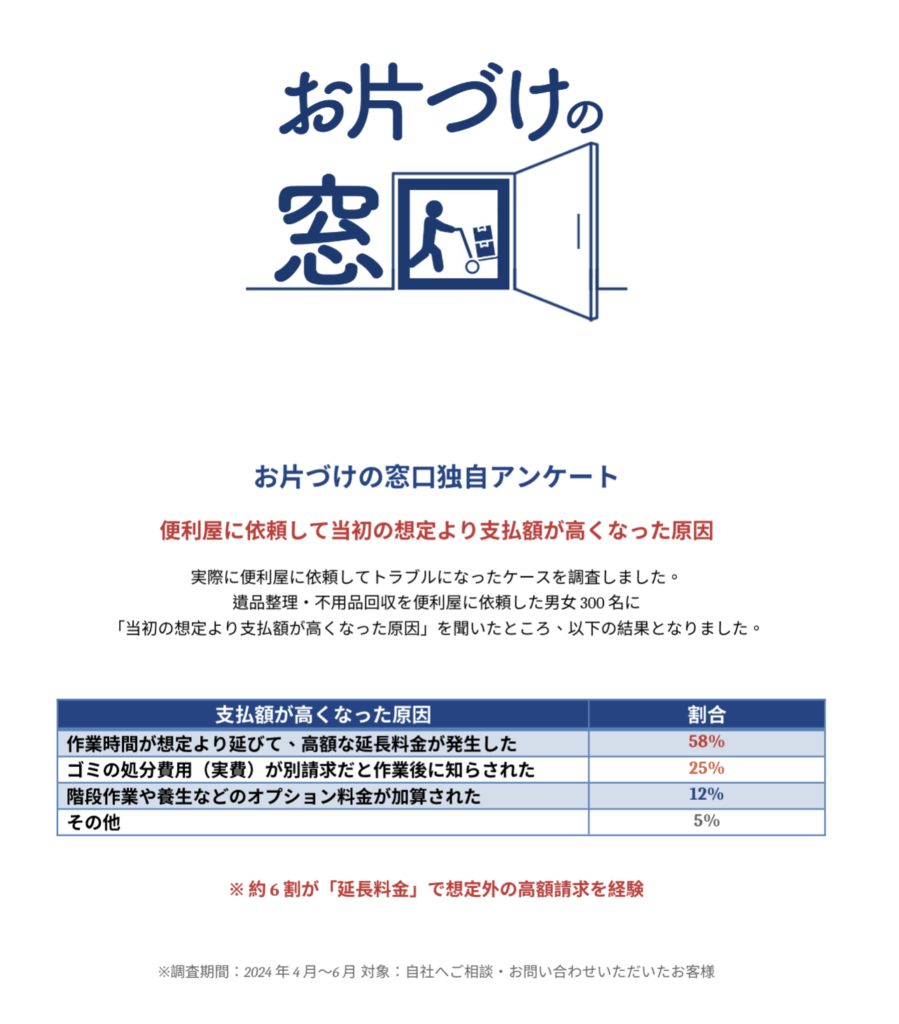 実際に便利屋に依頼してトラブルになったケースを調査しました。 遺品整理・不用品回収を便利屋に依頼した男女300名に「当初の想定より支払額が高くなった原因」を聞いたところ、以下の結果となりました。