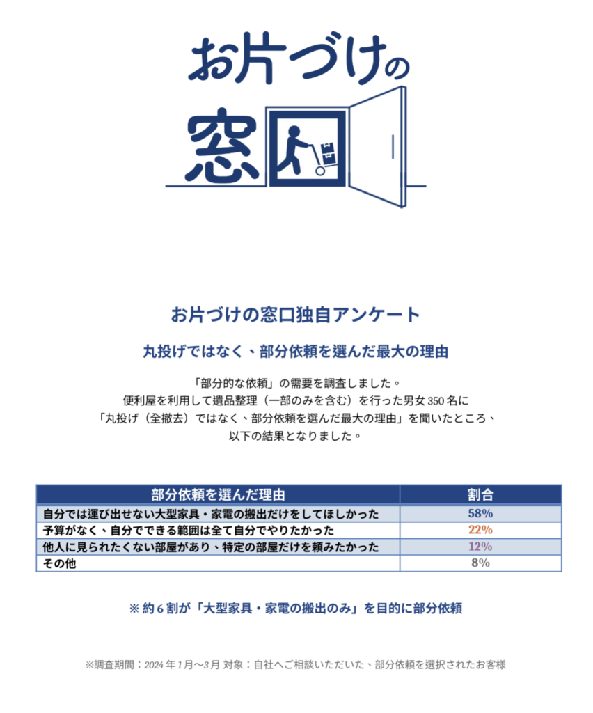 「部分的な依頼」の需要を調査しました。 便利屋を利用して遺品整理(一部のみを含む)を行った男女350名に「丸投げ(全撤去)ではなく、部分依頼を選んだ最大の理由」を聞いたところ、以下の結果となりました。