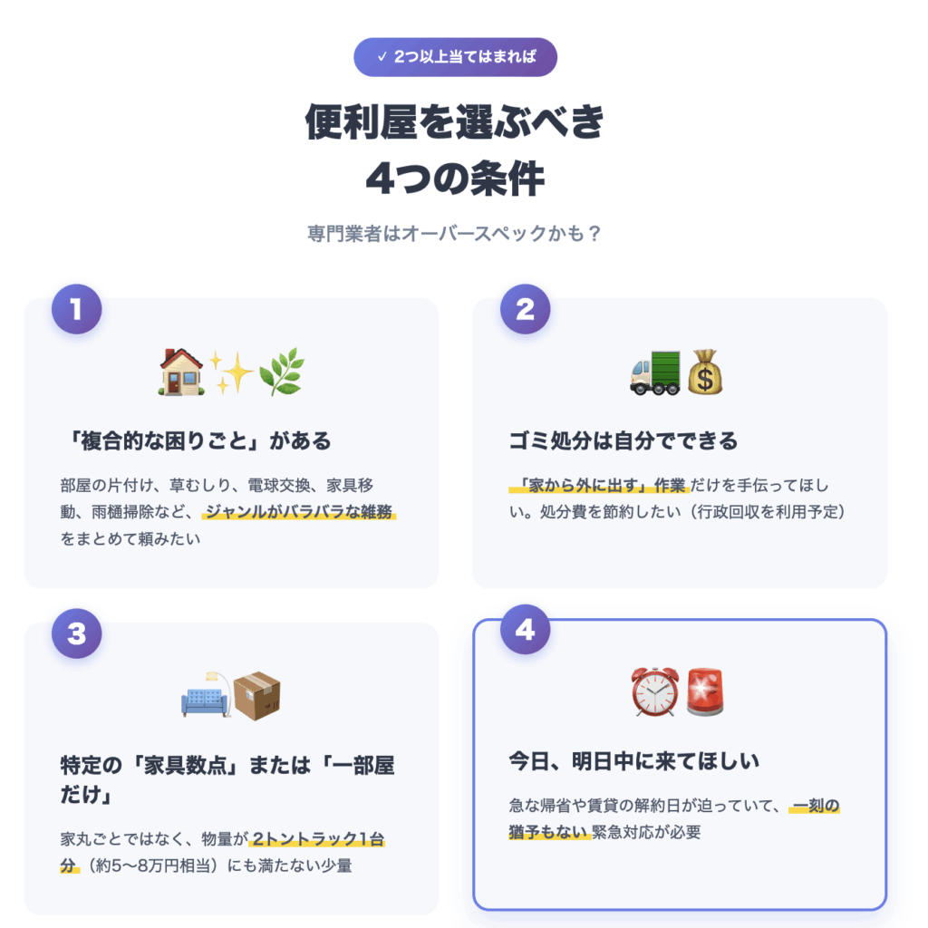 もしあなたが以下の条件に2つ以上当てはまるなら、迷わず便利屋(ただし優良な)に連絡してください。専門業者に頼むと、オーバースペックで損をする可能性が高いです。