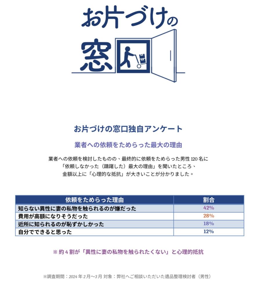 - 業者に頼みたいが、「男性スタッフに妻の部屋を見られたくない」「近所に知られたくない」と躊躇している方