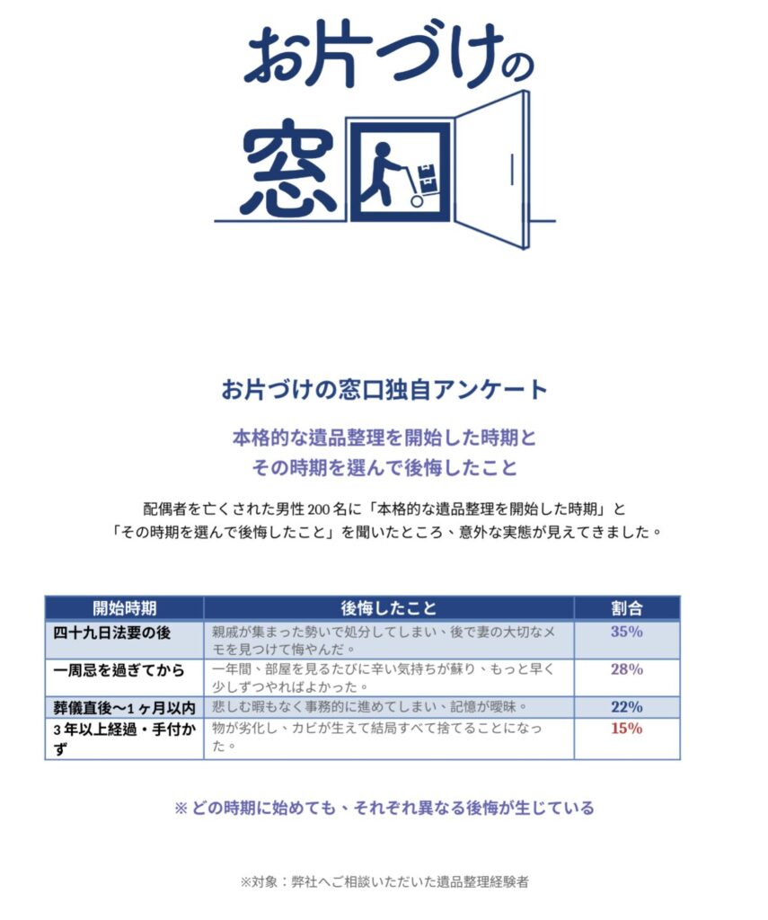 配偶者を亡くされた男性200名に「本格的な遺品整理を開始した時期」と「その時期を選んで後悔したこと」を聞いたところ、意外な実態が見えてきました。