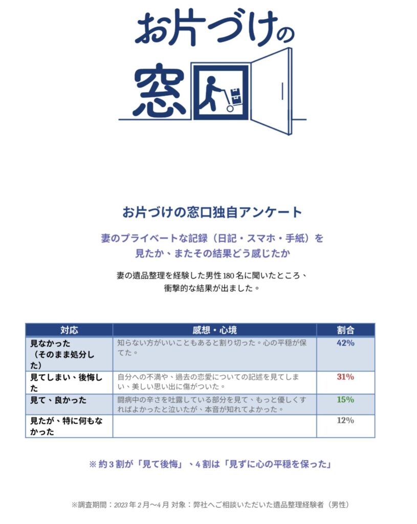 妻の遺品整理を経験した男性180名に「妻のプライベートな記録(日記・スマホのLINE・手紙)を見たか、またその結果どう感じたか」を聞いたところ、衝撃的な結果が出ました。