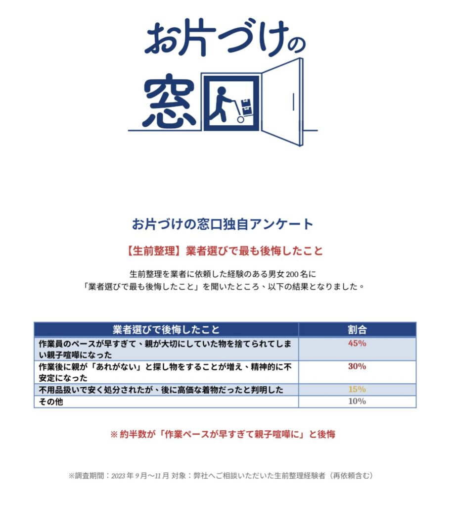 - 作業員のペースが早すぎて、親が大切にしていた物を捨てられてしまい親子喧嘩になった(45%)