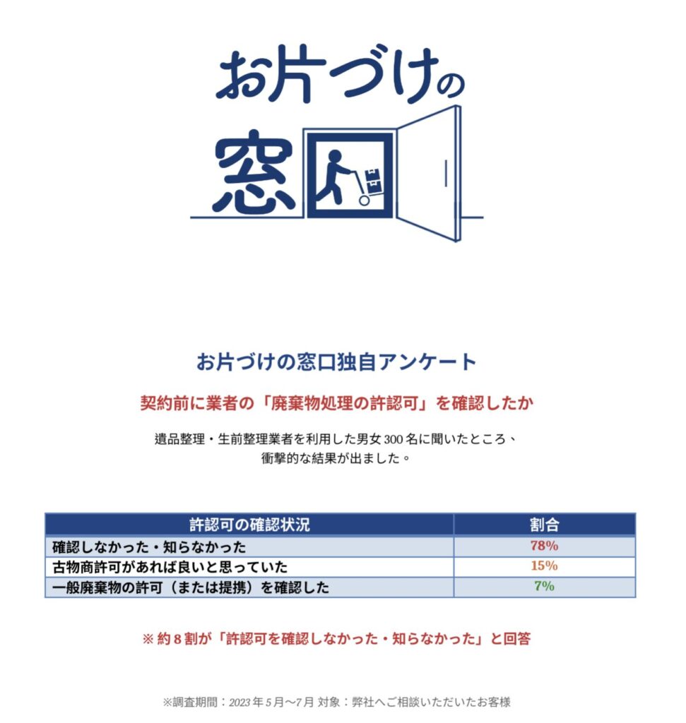 遺品整理・生前整理業者を利用した男女300名に「契約前に業者の『廃棄物処理の許認可』を確認したか」を聞いたところ、衝撃的な結果が出ました。