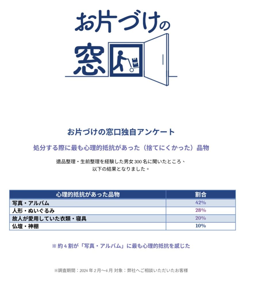 遺品整理・生前整理を経験した男女300名に「処分する際に最も心理的抵抗があった(捨てにくかった)品物」を聞いたところ、以下の結果となりました。