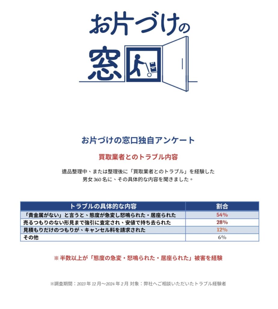 - 「貴金属がない」と言うと、態度が急変し怒鳴られた・居座られた(54%)