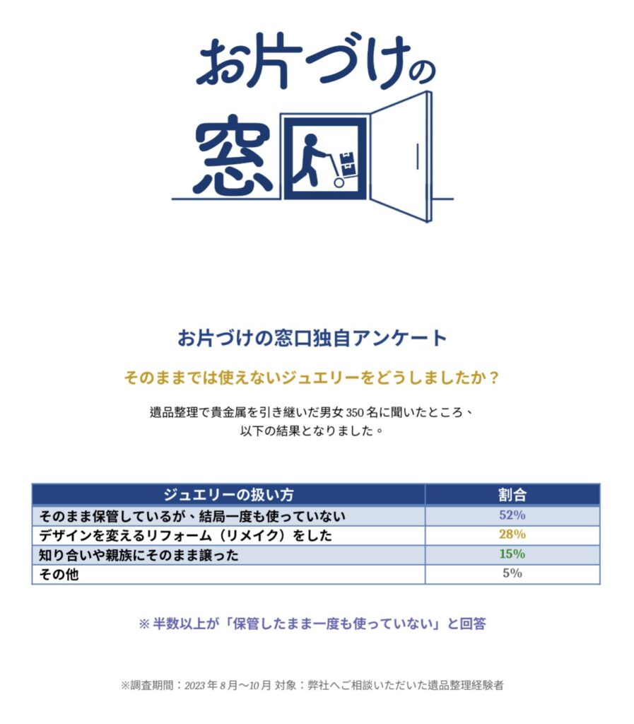 遺品整理で貴金属を引き継いだ男女350名に「そのままでは使えないジュエリーをどうしましたか?」と聞いたところ、以下の結果となりました。