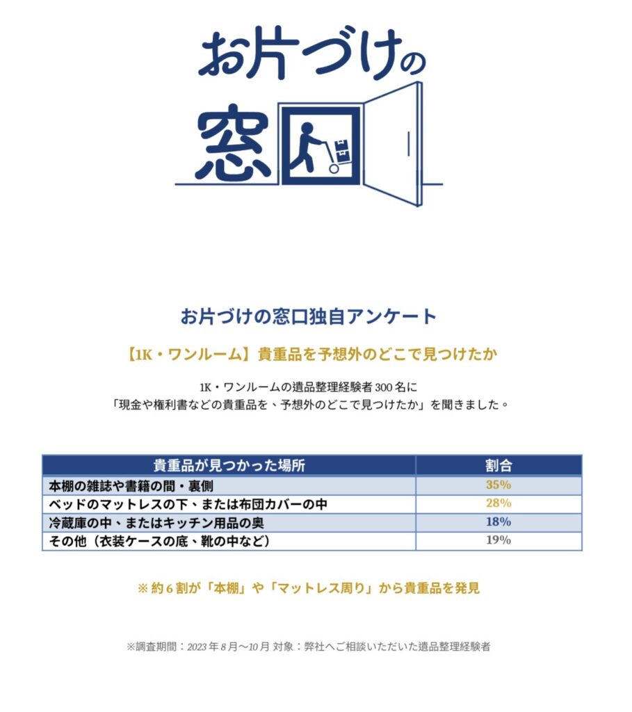 1K・ワンルームの遺品整理経験者300名に「現金や権利書などの貴重品を、予想外のどこで見つけたか」を聞いたところ、以下の結果となりました。