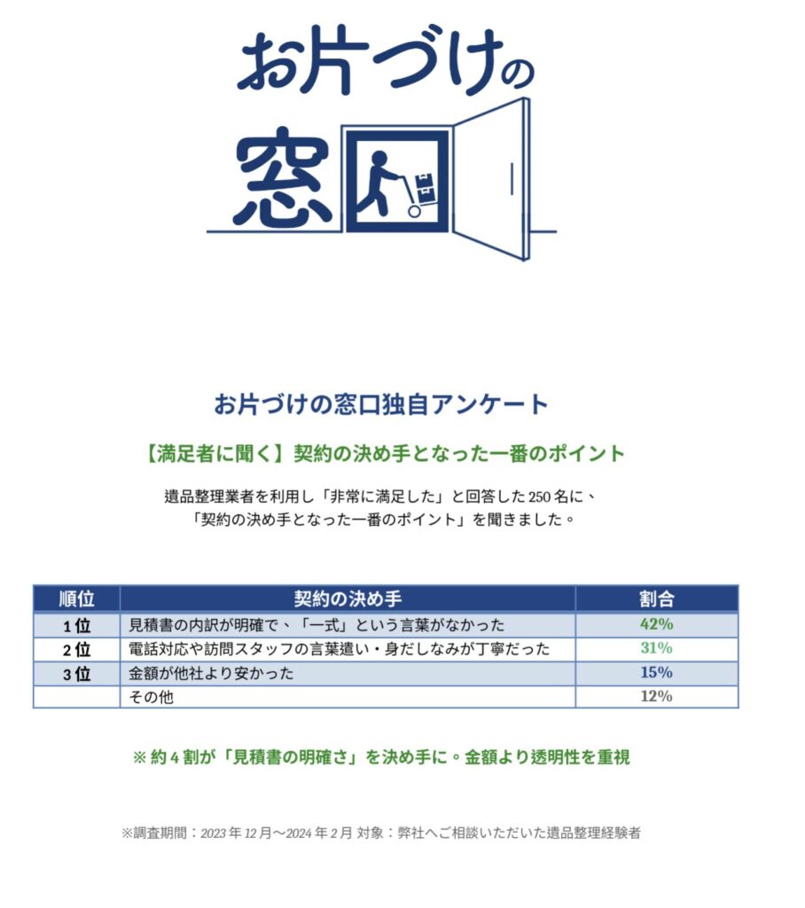 遺品整理業者を利用し「非常に満足した」と回答した250名に、「契約の決め手となった一番のポイント」を聞きました。