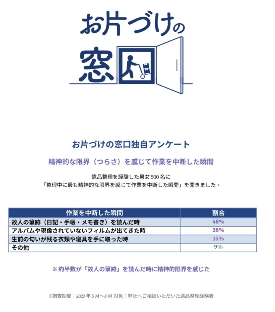 遺品整理を経験した男女500名に「整理中に最も精神的な限界(つらさ)を感じて作業を中断した瞬間」を聞いたところ、以下の結果となりました。