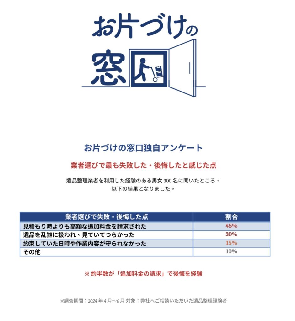 遺品整理業者を利用した経験のある男女300名に「業者選びで最も失敗した、後悔したと感じた点」を聞いたところ、以下の結果となりました。