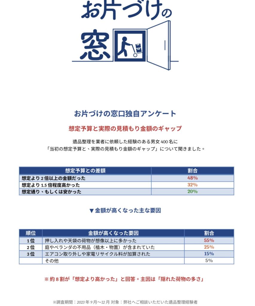 遺品整理を業者に依頼した経験のある男女400名に「当初の想定予算と、実際の見積もり金額のギャップ」について聞いたところ、以下の結果となりました。