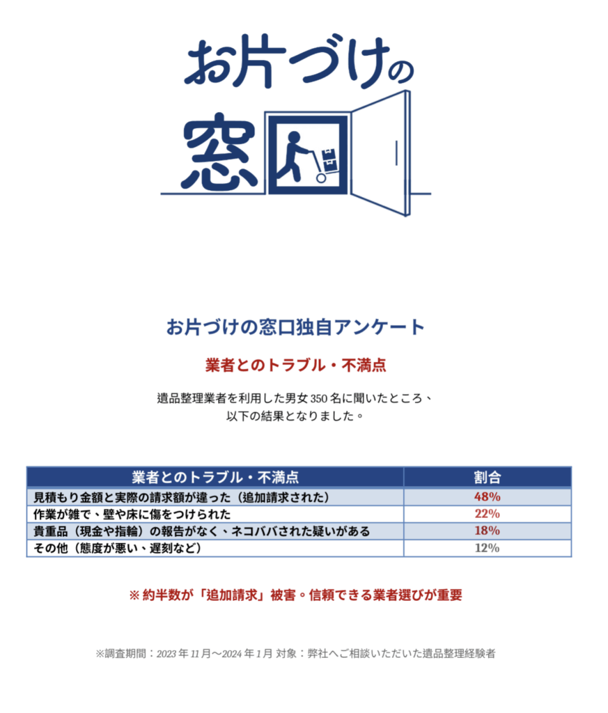 遺品整理業者を利用した男女350名に「業者とのトラブル・不満点」を聞いたところ、以下の結果となりました。