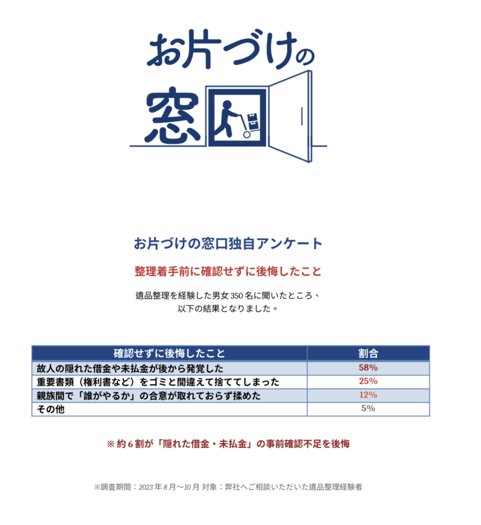 遺品整理を経験した男女350名に「整理着手前に確認せずに後悔したこと」を聞いたところ、以下の結果となりました。