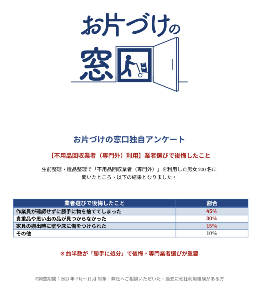 生前整理・遺品整理で「不用品回収業者(専門外)」を利用した男女200名に「業者選びで後悔したこと」を聞いたところ、以下の結果となりました。