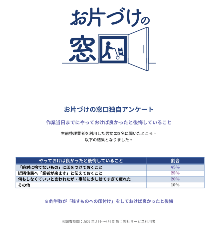 生前整理業者を利用した男女320名に「作業当日までにやっておけば良かったと後悔していること」を聞いたところ、以下の結果となりました。