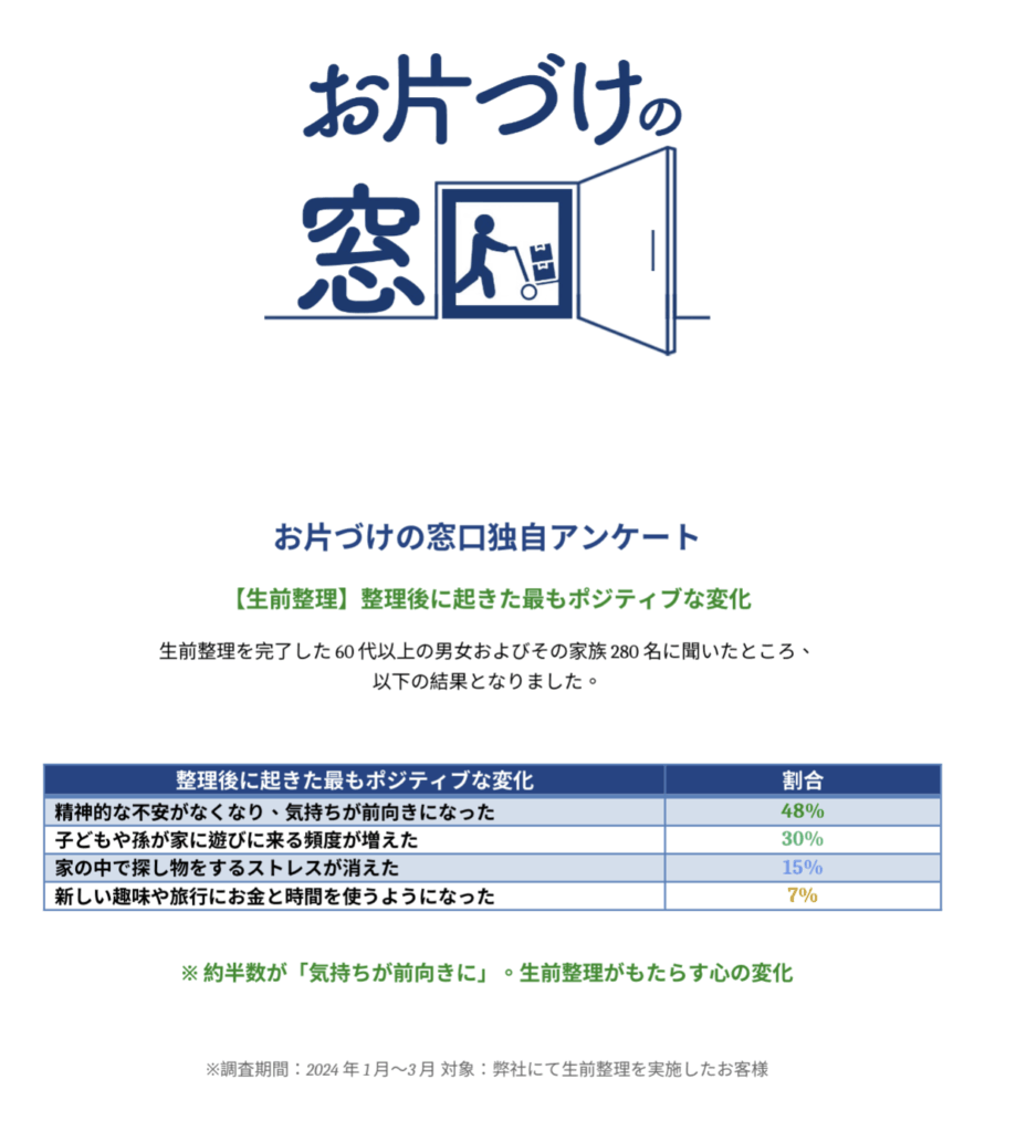 約半数の方が「メンタル面の改善」を挙げ、3割の方が「家族関係の好転」を実感しています。片付けは、ただ部屋をきれいにするだけでなく、人生の幸福度を底上げする力があるのです。