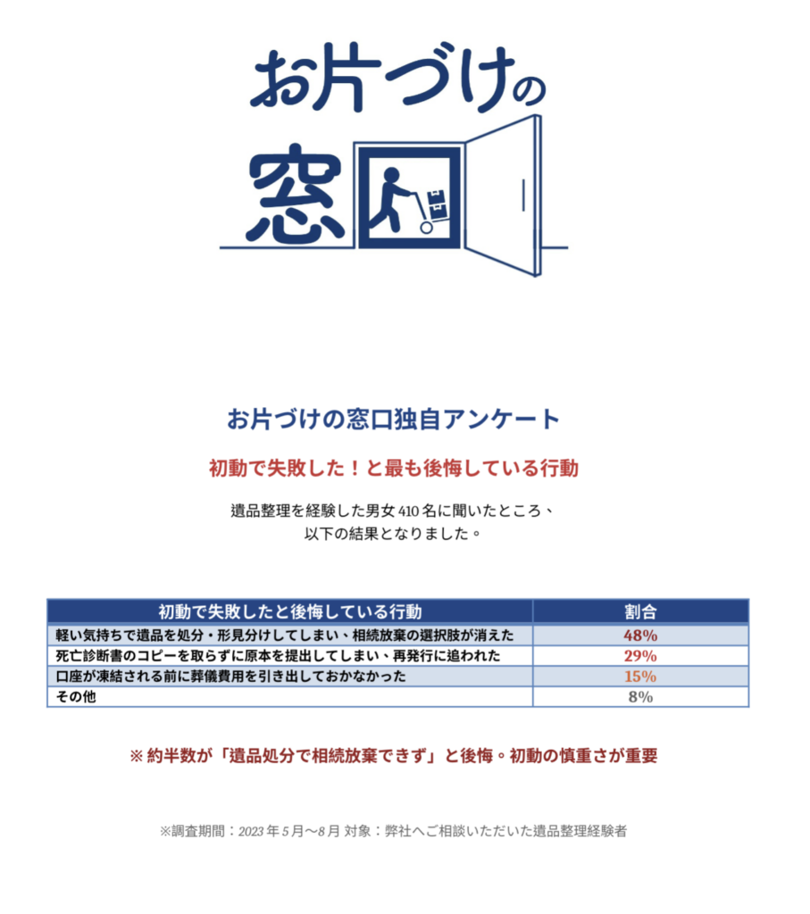 遺品整理を経験した男女410名に「初動で失敗した!と最も後悔している行動」を聞いたところ、以下の結果となりました。