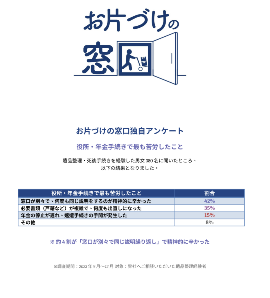 遺品整理・死後手続きを経験した男女380名に「役所・年金手続きで最も苦労したこと」を聞いたところ、以下の結果となりました。