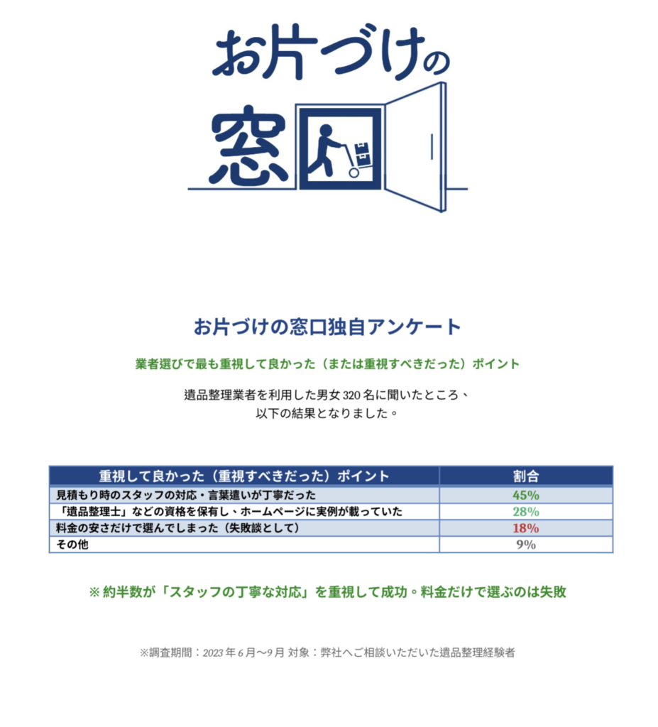 遺品整理業者を利用した男女320名に「業者選びで最も重視して良かった(または重視すべきだった)ポイント」を聞いたところ、以下の結果となりました。